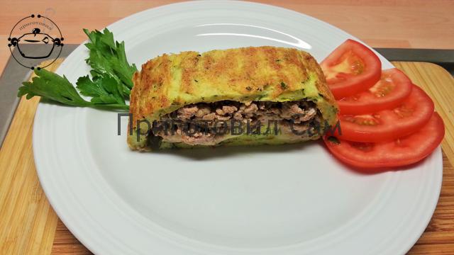 Состав ингредиентов: Цукини 2-4шт. Мука около 150г. Пекарный порошок 1ч. ложка яйца 3-4шт. мясной фарш 700г. грибы (морожен.) 200г. репчатый лук 2шт. петрушка Голосование голосуем